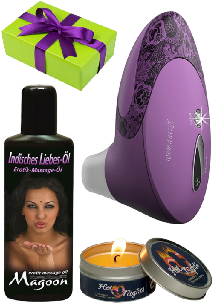 Das Womanizer Pro W500 Lavender + Massageöl + Duftkerze im Geschenkset - fix und fertig als Geschenk verpackt. Zum sofort Verschenken.