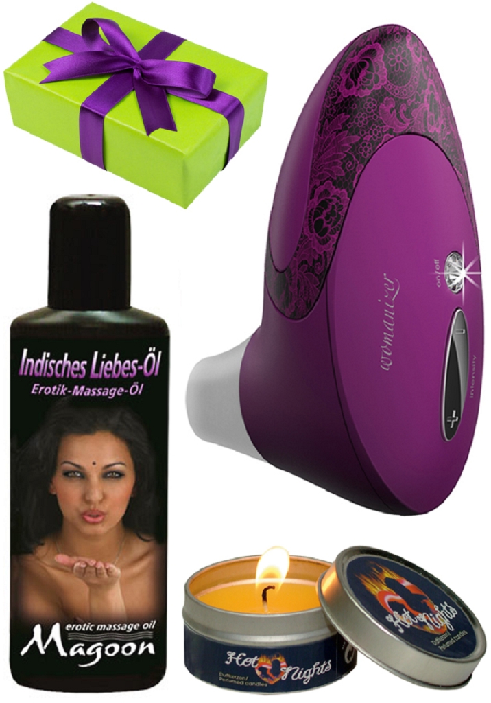 Das Womanizer Pro W500 Magenta + Massageöl + Duftkerze im Geschenkset - fix und fertig als Geschenk verpackt. Zum sofort Verschenken.
