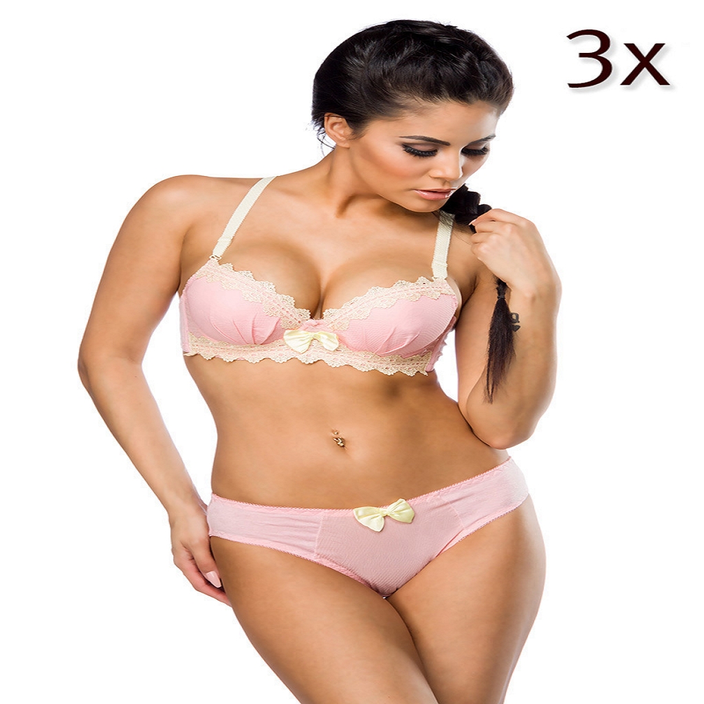 Zweifarbiges hochwertiges BH-Set bestehend aus BH und Slip mit softem Material inklusive Baumwollanteil und dreifachem Haken- und Ösenverschluss. Der Tragekomfort ist durch die stufenlosen verstellbaren Trägern und die Soft Cups gesichert. Optisch besticht das Set durch die dekorativen Schleife am Steg und durch die Häkelspitze.Lieferumfang: 3 BHs, 3 SlipsFarbe: rosa/beigeMaterial: 60% Polyester, 40% BaumwolleGröße: Hinweis: z. B. 32/B entspricht Konfektionsgröße 32/Cup B