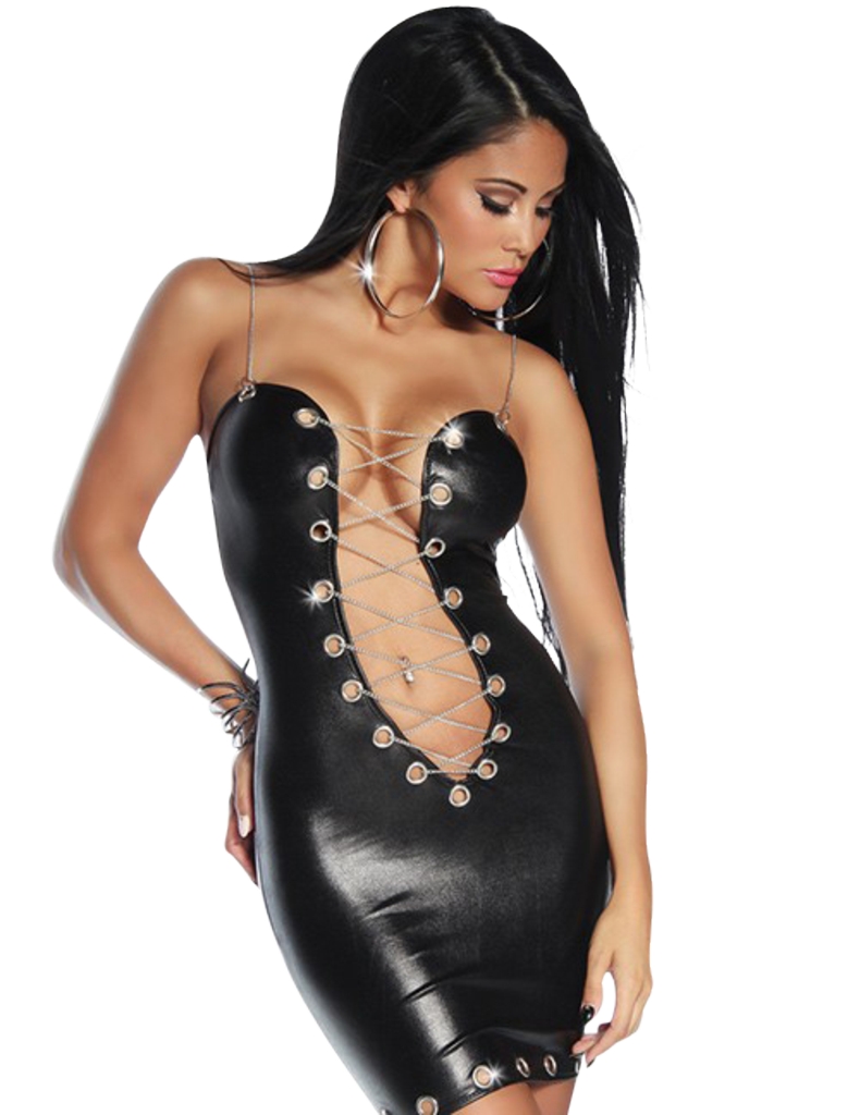 Saresia Wetlook KleidEine atemberaubende Style-Idee: In dieses Wetlook-Minikleid ist der Schmuck schon eingearbeitet ? und zwar in Form von Ketten, die alle Blicke fesseln. So sorgt ein Schnürzug aus silberfarbenen Ösen und Ketten für einen glanzvollen Auftritt, sinnliche Figurbetonung und ein aufregendes, extrem tiefes Dekolleté. Auch die verstellbaren Träger sind aus silberfarbenen Ketten gestaltet. Ein weiterer Blickfang: Die silberfarbenen Metallösen am Abschluss und im oberen Rückenbereich. So aufregend wie das Design ist auch das besonders weiche, schmiegsame, elastische Material ? das wie eine zweite Haut sitzt und ihren Sex-Appeal optimal zur Geltung bringt.Verführung pur: Heißer Wetlook & kühler Metall-SchmuckVerstellbare Träger aus silberfarbenen KettenSehr weich und elastischSilberfarbene Metallösen vorn und hinten