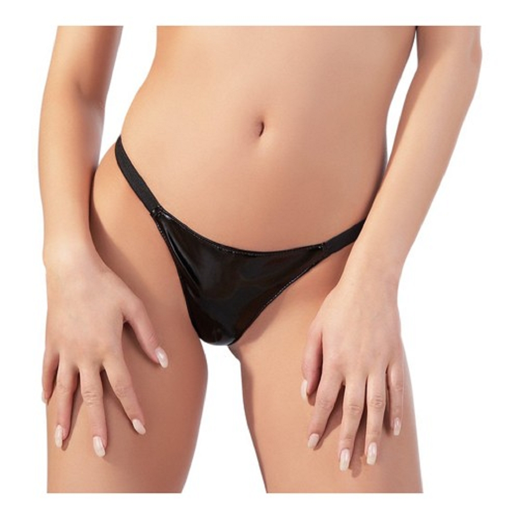 Klein, scharf, schwarz! Schlichter Lack-String in Stretch-Qualität. 50% Polyester, 50% Polyurethan.
