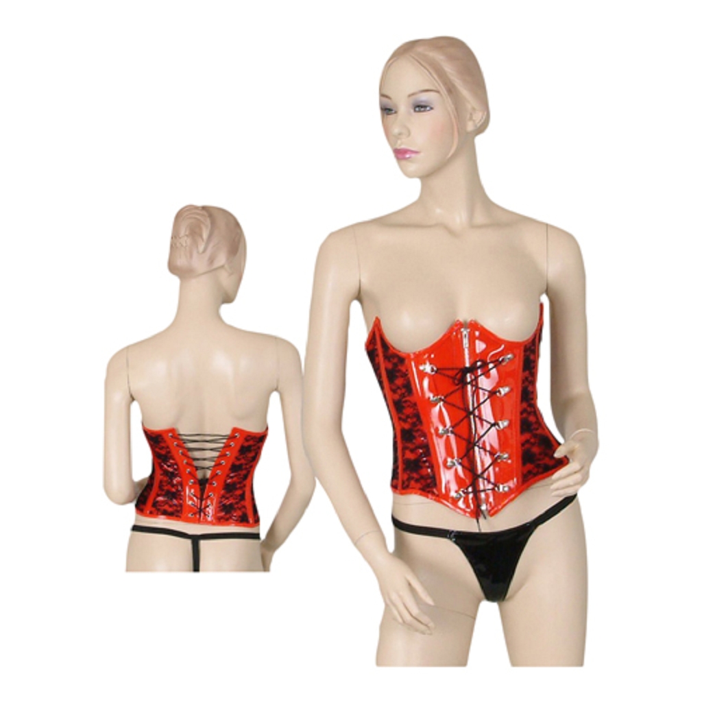Rote, busenfreie Corsage mit schwarzer Spitze überzogen und schwarzer Zierschnürung über dem Front-Reißverschluss. Hinten Zierschnürung. 90% Polyester, 10% Polyamid. Kleiner schwarzer String inklusive. 100 % Polyester. Beide Artikel mit Polyurethan-Beschichtung.