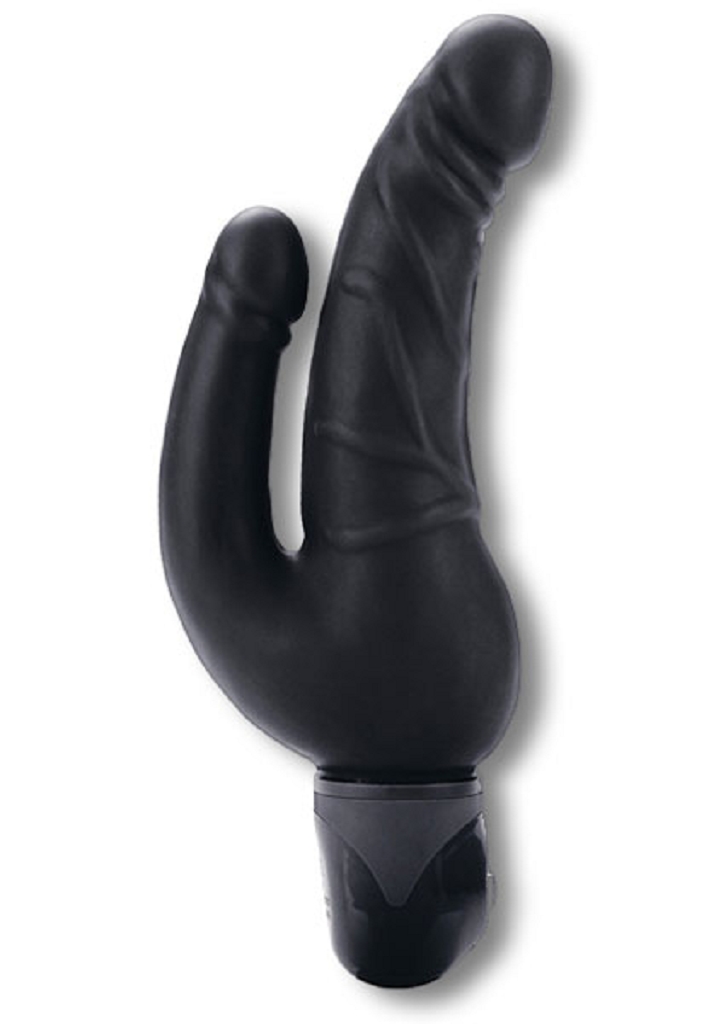 Doppelte Lust verspricht dieser Verwöhn-Vibrator. 23 cm lang, Durchmesser 4,5 und 2,5 cm. Schwarz. Benötigt 2 Mignon Batterien.