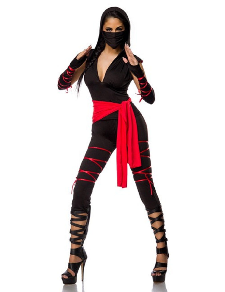 Sexy Ninja Kostümheißes Ninja-Outfit leichter Jersey in Baumwollqualitätmit angesetzter Oversize-Kapuzetief geschnittener V-Ausschnittangeschnittene Ärmelchen kontrastfarbenes Taillenbandinklusive Bändern für variable SchnürungenArmstulpen mit DaumenlochGesamtlänge Oberteil in Größe S-M ca. 48 cmGesamtlänge Hose in Größe S-M ca. 66 cm