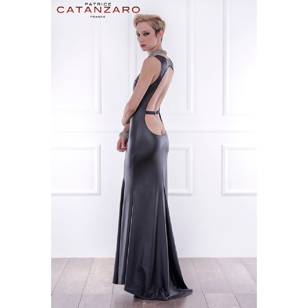 Dieses elegante wetlook Kleid ist ein absoluter Hingucker! Der tiefe U-Ausschnitt auf der Vorderseite betont Ihr Dekollete. Der enge Schnitt des Kleides betont Ihre Figur und geht in ein locker fallendes Kleid über. Die Rückseite ist etwas länger, sodass es leicht an eine angedeutete Schleppe erinnert. Der Fokus bei diesem Kleid liegt allerdings auf dem Rücken. Der Rückenausschnitt ist sehr tief, sodass der Po schon leicht angedeutet wird. Ein schmales Gummiband unterteilt den Rücken und ist mit einer Metallverzierung aufgewertet.Farbe: schwarzGr&